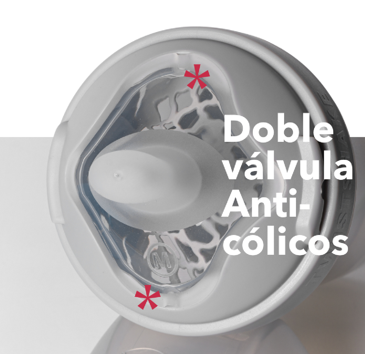 El sistema avanzado de doble válvula permite que las burbujas de aire regresen a la mamadera en lugar de que entren al estómago del bebé, reduciendo así el riesgo de cólicos y facilitando una alimentación continua y tranquila.